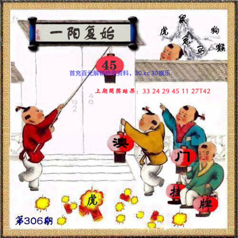 306期挂牌《一阳复始》 解释:指冬至日阴气尽,阳气又开始发生,象征春天到来 解料:阳气解阳肖牛虎兔羊猴鸡,挂:45爆:虎 七肖:虎鸡牛兔羊猴马 |