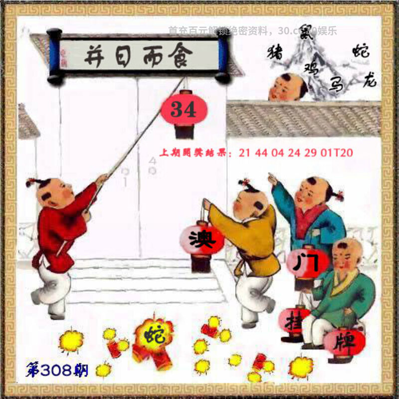 308期挂牌《并日而食》 解释:意指因贫困而两天只能吃一天的食物,形容生活极度穷困 解料:并日解日肖兔龙蛇马羊猴,挂:34爆:蛇 七肖:猴蛇兔龙马羊鸡 |